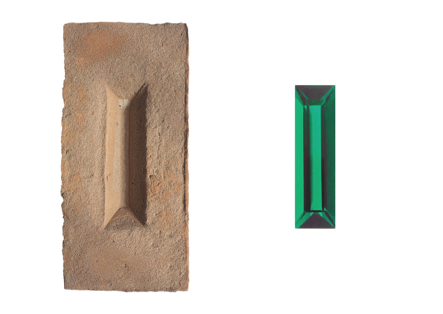 During my search for ways other than architecture to give value to a brick, I discovered one with a cutout that visually reminded me of a baguette cut. It also struck me as an interesting similarity that both the brick and the baguette cut gemstone do not have a function or value in themselves; their value depends on the broader picture, with more stones. Moreover, the similarity in "facets" prompted me to transform one "stone" into another - and to highlight its various stages. Thus was born a series of stone-cuts that create an unexpected bridge between architecture and jewelry.