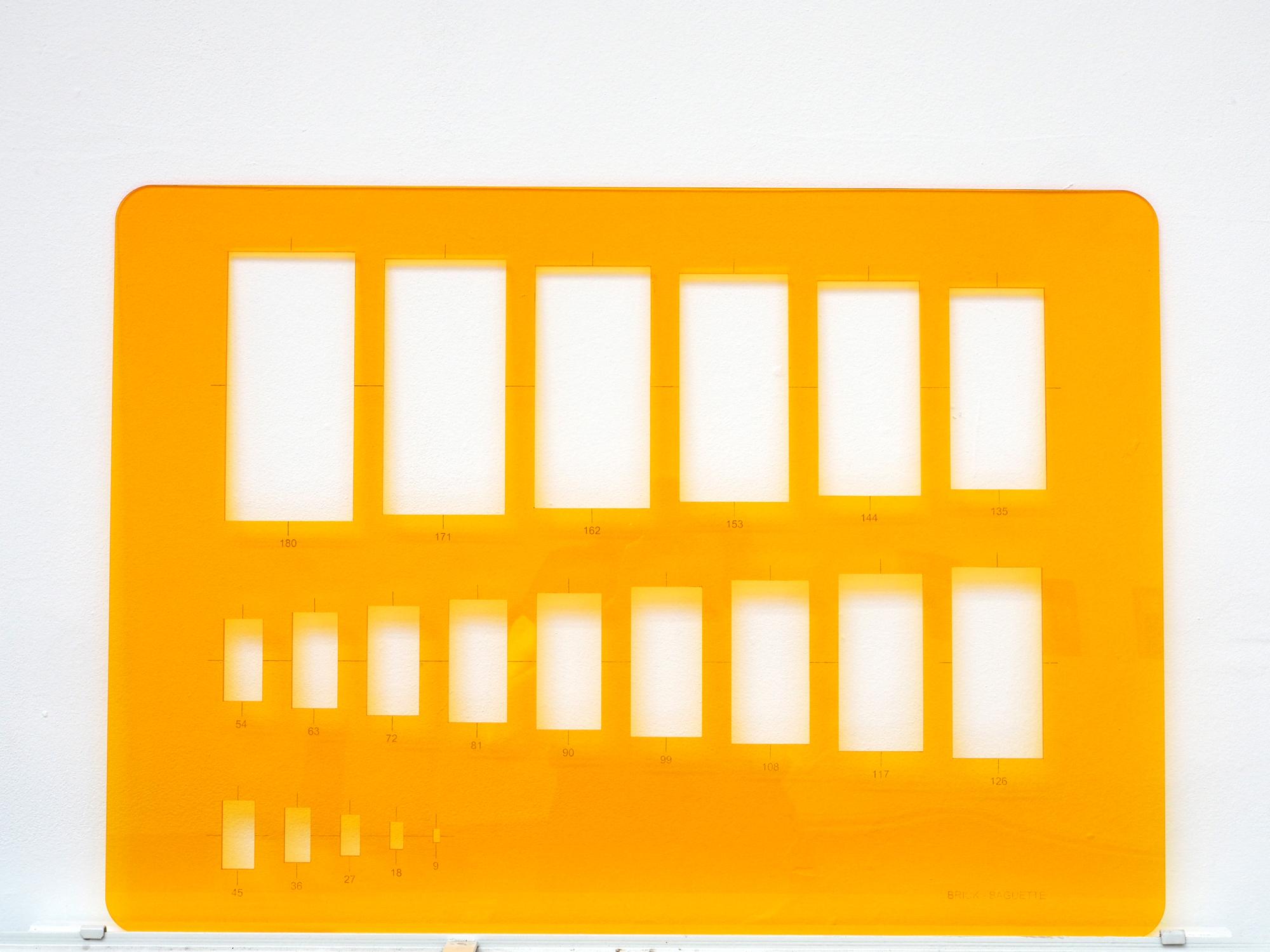 A template of orange acrylic is my final way of showing how architecture and jewelry are related to one another. The stencil, the fictitious "measuring instrument," refers to the tools needed in making analog plans or drawing ornaments. The twenty cutouts - transmutations - in the template refer to the similar proportions between brick and gemstone.