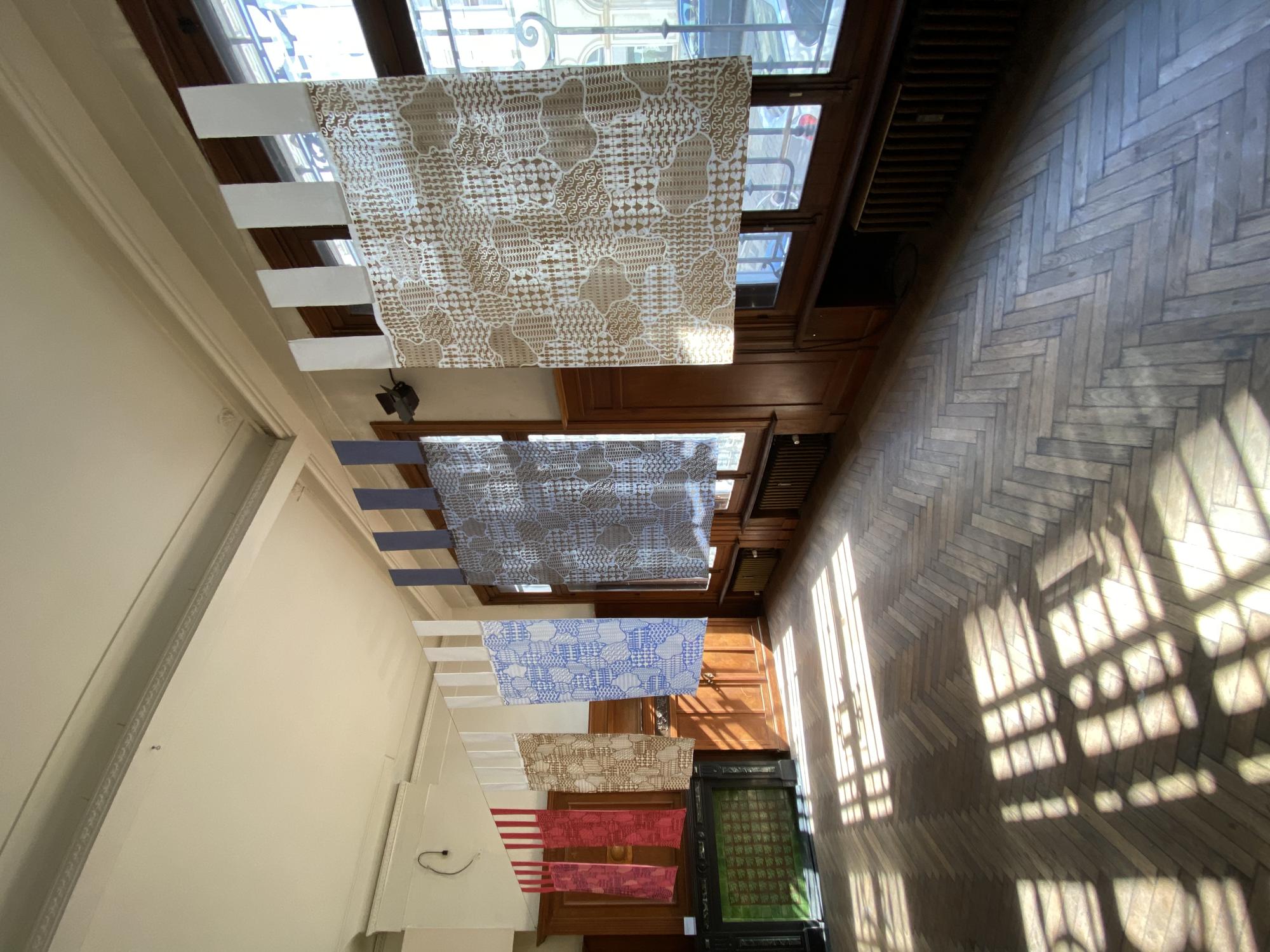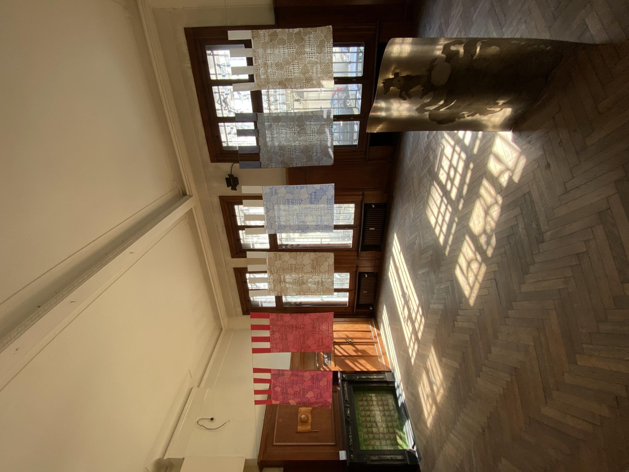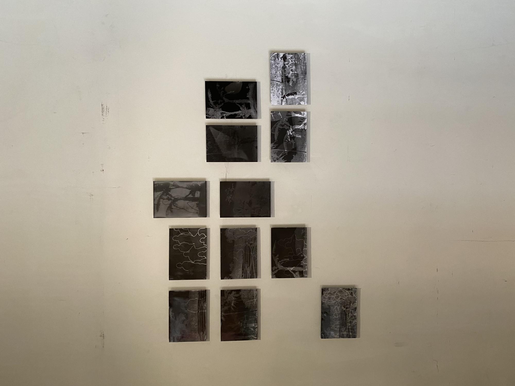 For my master's project, I shaped my love of printmaking techniques through a personal, family story. My grandfather was born in Indonesia, but with the German surname 'von Winckelmann'. My family lived in Indonesia for 250 years, but with a colonial history. The German surname originated from a baron in Germany in the 18th century, who was recruited for the Dutch army heading to Indonesia. That noble name also came with a coat of arms. This coat of arms was my starting point in my artistic journey. One of the basic printmaking techniques, etching, emerged while creating coats of arms in armor and shields for knights. I combine this primal technique in a contemporary way with a traditional art form of Indonesia, batik. This work consists of a sculptural etching with the outline of my coat of arms filled with patches of beeswax randomly created by fire flames and acidified layer by layer. My next work will focus more on Indonesian batik. In a series of flags inspired by medieval flags with coats of arms, I present the batik process step by step. I color the flags myself and screen print a pattern on them using beeswax. Here I transform the traditional technique into a more modern execution. The pattern is inspired by batik Sekar Jagdad. This pattern symbolizes the diversity in Indonesia, and in another way also the diversity in my family history. The stains in this pattern are a reference to the wax stains in my previous work and each of these stains are filled in with a pattern of my own design. These smaller patterns are each an element taken from the coat of arms. To this I added 1 additional pattern consisting of pearl necklaces. This symbolizes myself and the position of women in batik and passing on the noble family surname. The 2 colors I use here, blue and red are the most used colors in West-Java. This is again a reference to my grandfather, he was born and raised in the city of Bandung, this is the capital of West-Java. Finally, as the last part of my master's project, I present an analogue photo series on canvas, consisting of nature photos from my grandfather's photo archive from Indonesia with faded silhouettes of family portraits of my grandfather and his family in Indonesia on top. This refers to the colonial part of my family history. The 3 works in total tell my personal story and vision of my cultural background and everything that comes with it.