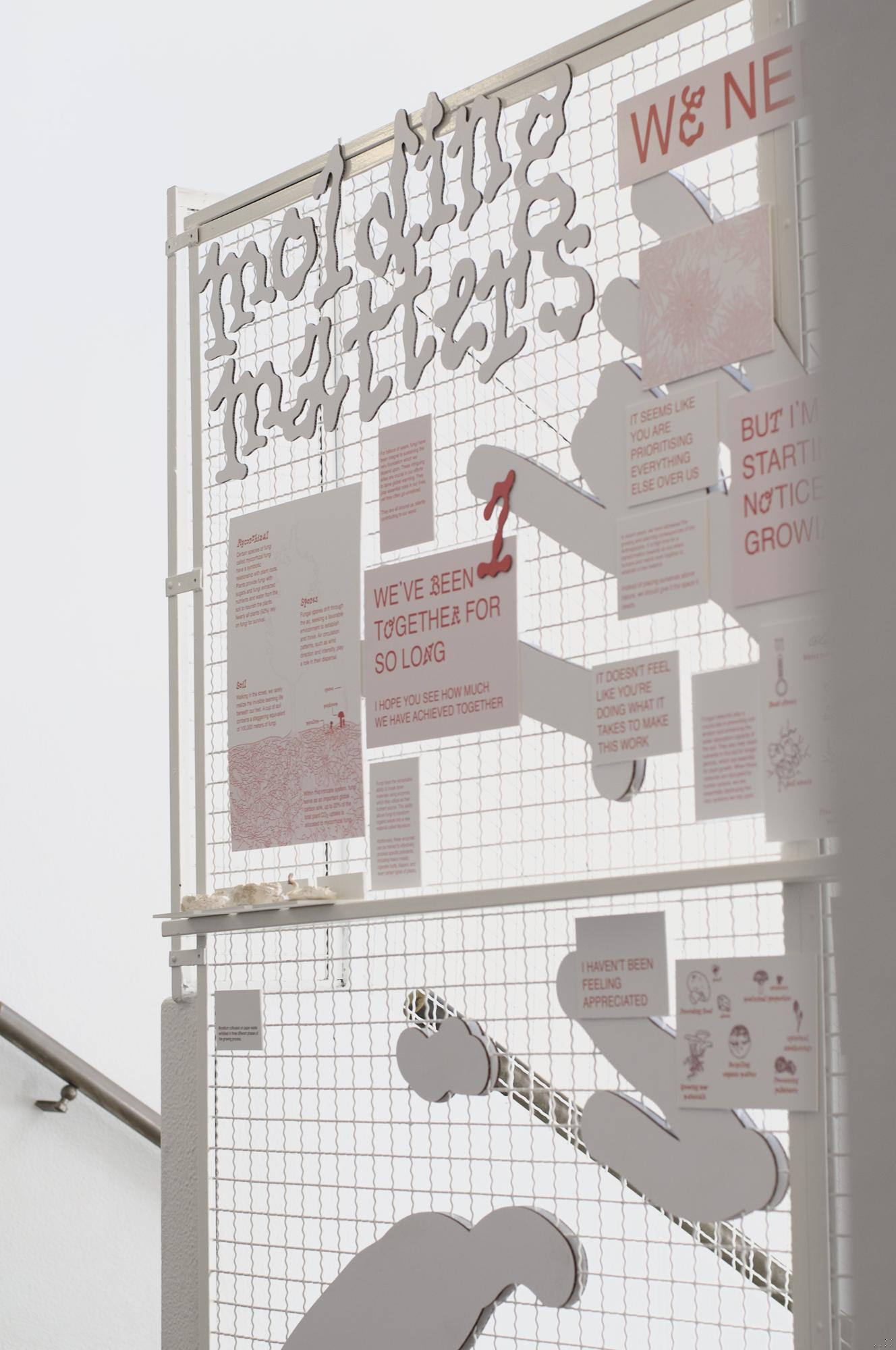 Fungi will play a fundamental role in shaping our future lives, just as they have done for billions of years. However, their significance is often overlooked, despite their prominent position within our ecosystem. The concept of the 'Symbioceen' represents a new era where humans, nature, and technology coexist in a balanced symbiotic relationship. This philosophy serves as the foundation for this project, aiming to transform our current relationship with fungi. In the installation Molding Matters, you are guided through a critical conversation that explores the crucial bond within this relationship from a fungal perspective. This is done by drawing parallels between well-known questions pertaining to human love relationships and the connection we, as humans, have with fungi. Through this conversation, you gradually gain a deeper understanding of these beautiful organisms. Ultimately, you have the opportunity to demonstrate your commitment to this relationship by placing mycelium on the wall and actively contributing to ‘mold’ our surroundings. Molding Matters aims to evoke a sense of empathy and curiosity within you, fostering a profound appreciation for this largely mysterious species.