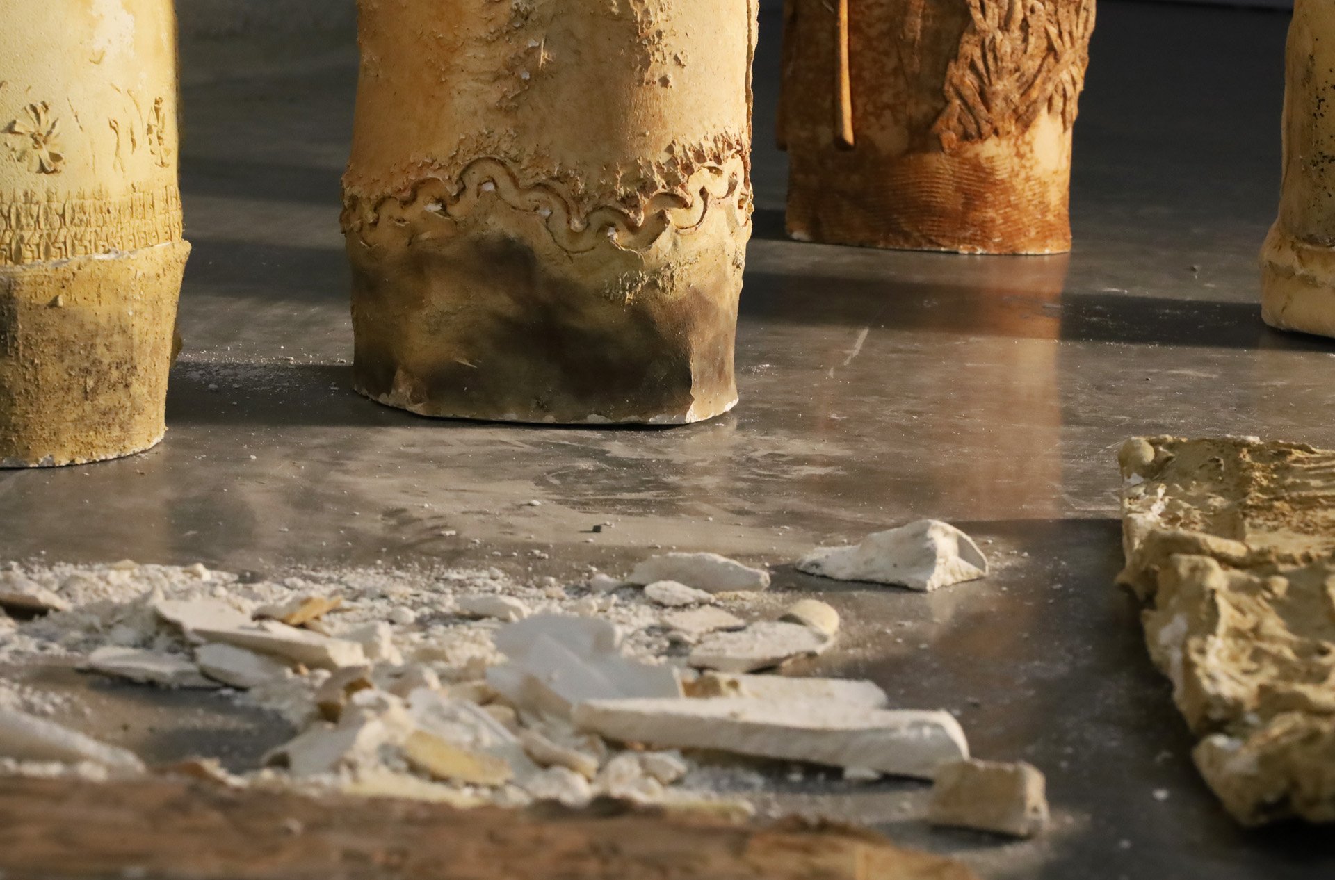 Mijn kunstproject, getiteld "La Révélation de Mes Ruïnes", is een verkenning van vergankelijkheid, tijd en persoonlijke herinneringen, weergegeven door een installatie van gipsen sculpturen. Door het gebruik van plaaster en klei-afdrukken, ontstaat een archeologisch effect dat de kwetsbaarheid en tijdelijke aard van het bestaan weerspiegelt. Als iemand die veel objecten verzamelt, integreer ik enkele in mijn werk, waardoor het een persoonlijke en intieme dimensie krijgt. Natuurlijke elementen zoals verwelkte bloemen, symbolen van vergankelijkheid en tijd, spelen een belangrijke rol in mijn creaties. De esthetiek van deze vergankelijke bloemen inspireren mij en versterkt de thematiek. Mijn werk belichaamt een voortdurende zoektocht naar het vastleggen van de cycli van het leven en de balans tussen herinnering en vergankelijkheid. De installatie nodigt het publiek uit om stil te staan bij vergankelijkheid, de impact van persoonlijke herinneringen. Door het tonen van deze gelaagdheid en de fragiliteit van de materialen, benadruk ik hoe herinneringen net zo kwetsbaar en vergankelijk zijn als de materiële wereld zelf. Elk stuk in deze installatie vertelt een verhaal van transformatie en verlies. "La Révélation de Mes Ruïnes" is een uitnodiging om na te denken over de onophoudelijke cyclus van leven en verval, en hoe deze ons definieert.