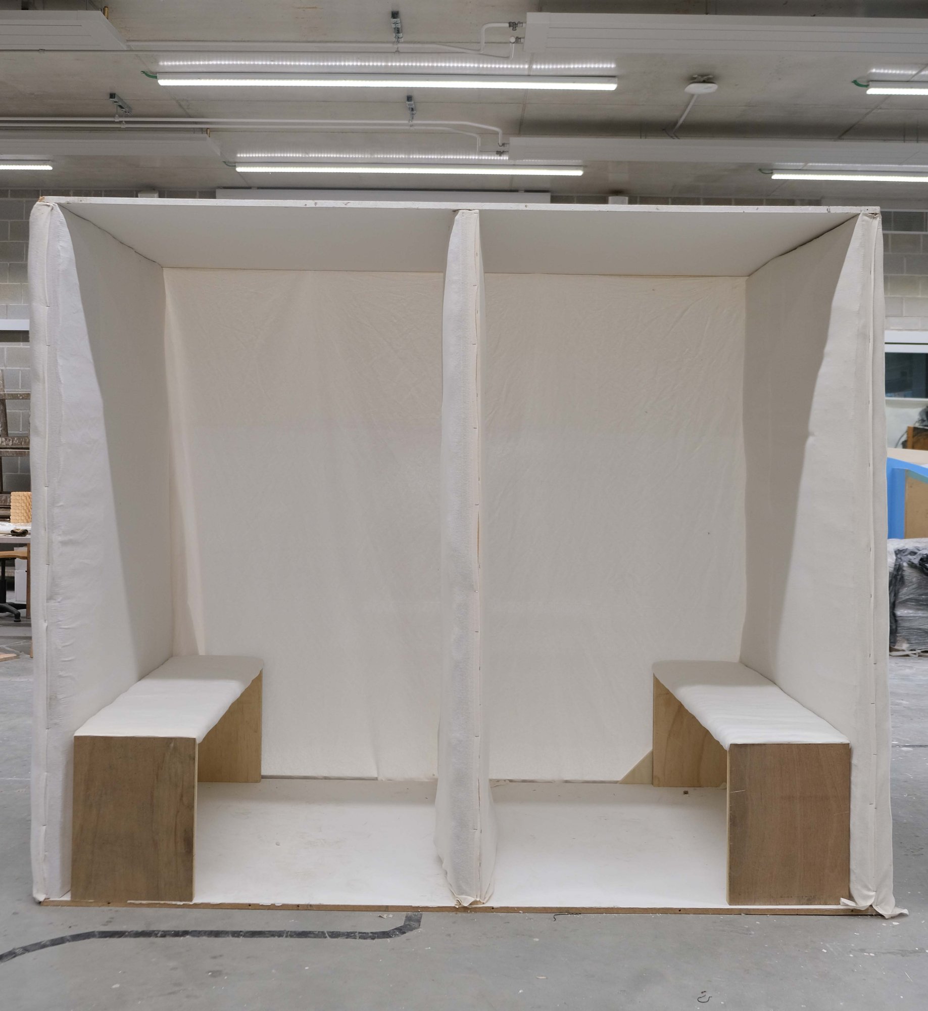 Shift 121,50 is een aangrijpende installatie die drie verhalen uit de zorgsector belicht. Elk verhaal biedt een uniek perspectief op de dagelijkse realiteit van zorgprofessionals. De eerste ruimte van de installatie brengt de kijker in contact met het verhaal van een operatieverpleegkundige die een orgaandonatie begeleidt. Met een zorgvuldig opgezette video en geluidsfragmenten wordt de kijker meegenomen in de intense emoties en professionele toewijding die gepaard gaan met deze ervaring. Een bankje nodigt uit tot contemplatie terwijl het verhaal zich ontvouwt. In de tweede ruimte dompelt een verpleegkundige de bezoeker onder in haar persoonlijke reflecties over 'de laatste adem' van mensen. De intieme details en gevoelens die ze deelt, worden versterkt door een zorgvuldig geselecteerde visuele en auditieve presentatie. Het bankje in deze ruimte biedt de gelegenheid om stil te staan bij de betekenis van deze momenten in het leven. Aan de achterkant van de installatie wordt een derde verhaal geprojecteerd, dat het dagelijkse leven van een zorgkundige in een woonzorgcentrum belicht. De video legt een scala aan taken en uitdagingen vast die zorgprofessionals dagelijks tegenkomen. Dit aspect van de installatie biedt een breder perspectief op het alledaagse werk in de zorg. Om de sfeer van een ziekenhuis of woonzorgcentrum te versterken, is de installatie omhuld met bouwkatoen. Achter deze stof is isolatie aangebracht, waardoor een rustgevende omgeving ontstaat dat de beleving van de installatie verder verdiept. Met Shift 121,50 worden niet alleen verhalen verteld, maar wordt ook een ruimte gecreëerd voor reflectie en empathie ten aanzien van de mensen die dagelijks zorgen voor anderen.